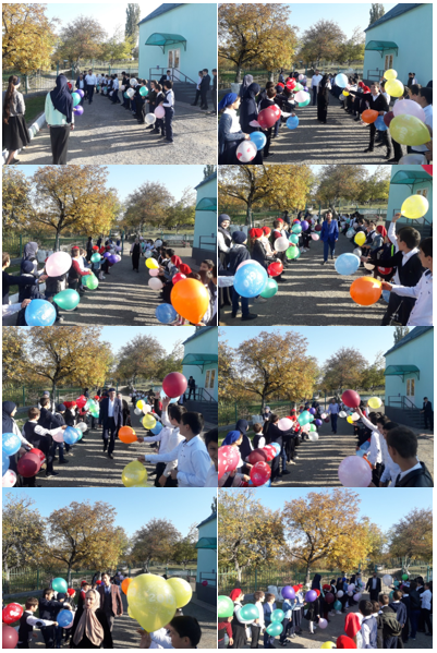 Поздравление учителей проходило в красивой и праздничной атмосфере, учащиеся всех классов с разноцветными шариками стояли у входа в школу.