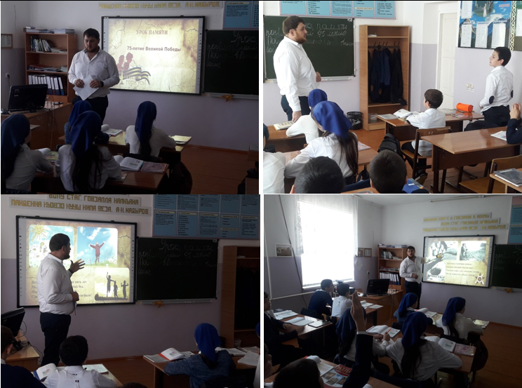 10.10.2019На основании письма директора Департамента государственной политики в сфере общего образования Министерства просвещения РФ Ж.В. Садовниковой и в связи с поручением Управления образования Курчалоевского муниципального района, в целях сохранения исторической памяти и ознаменования 75-летия Победы в Вов 1941-1945 годов в школе 10.10.2019 года был проведен открытый урок «Урок памяти».