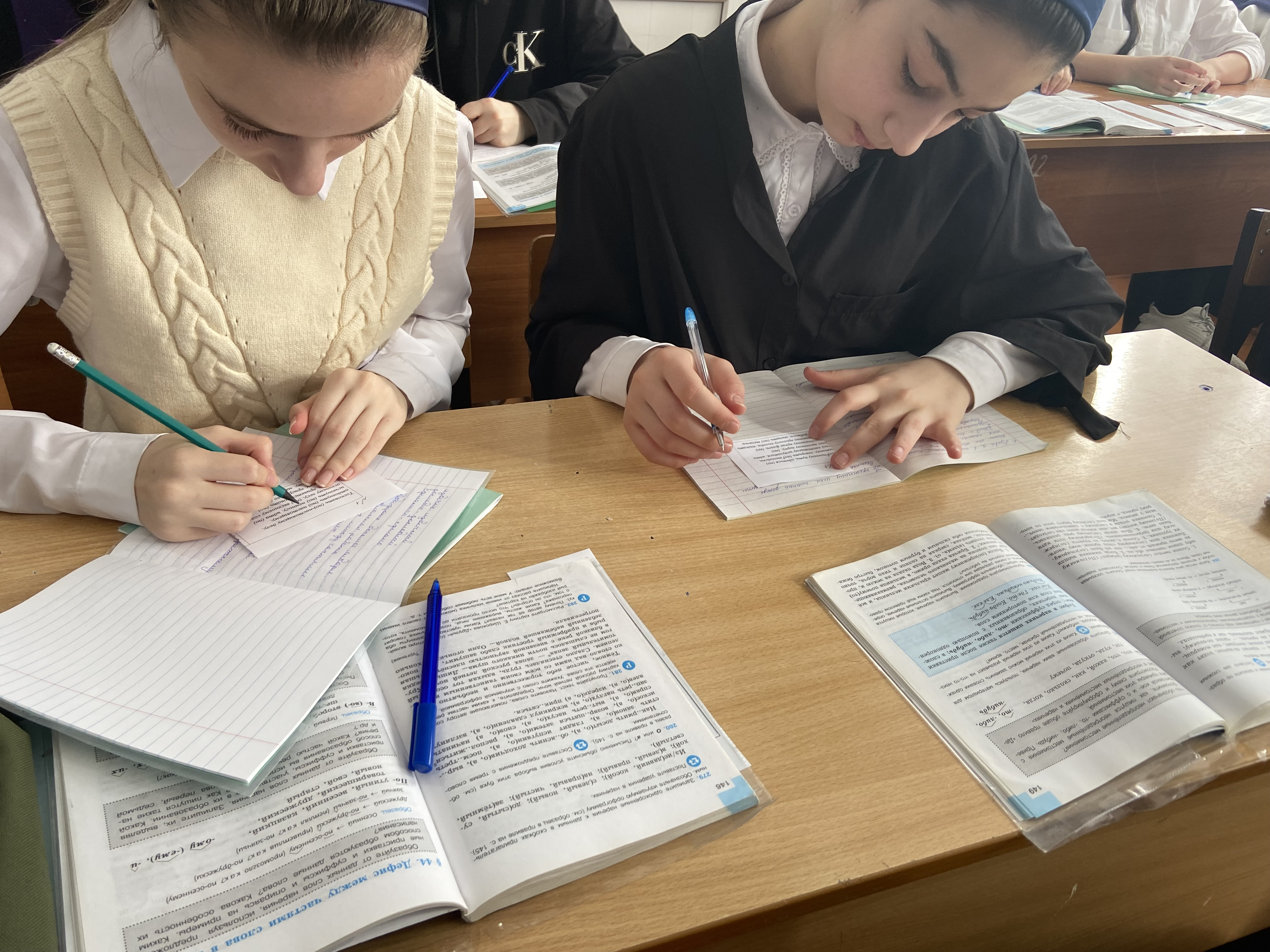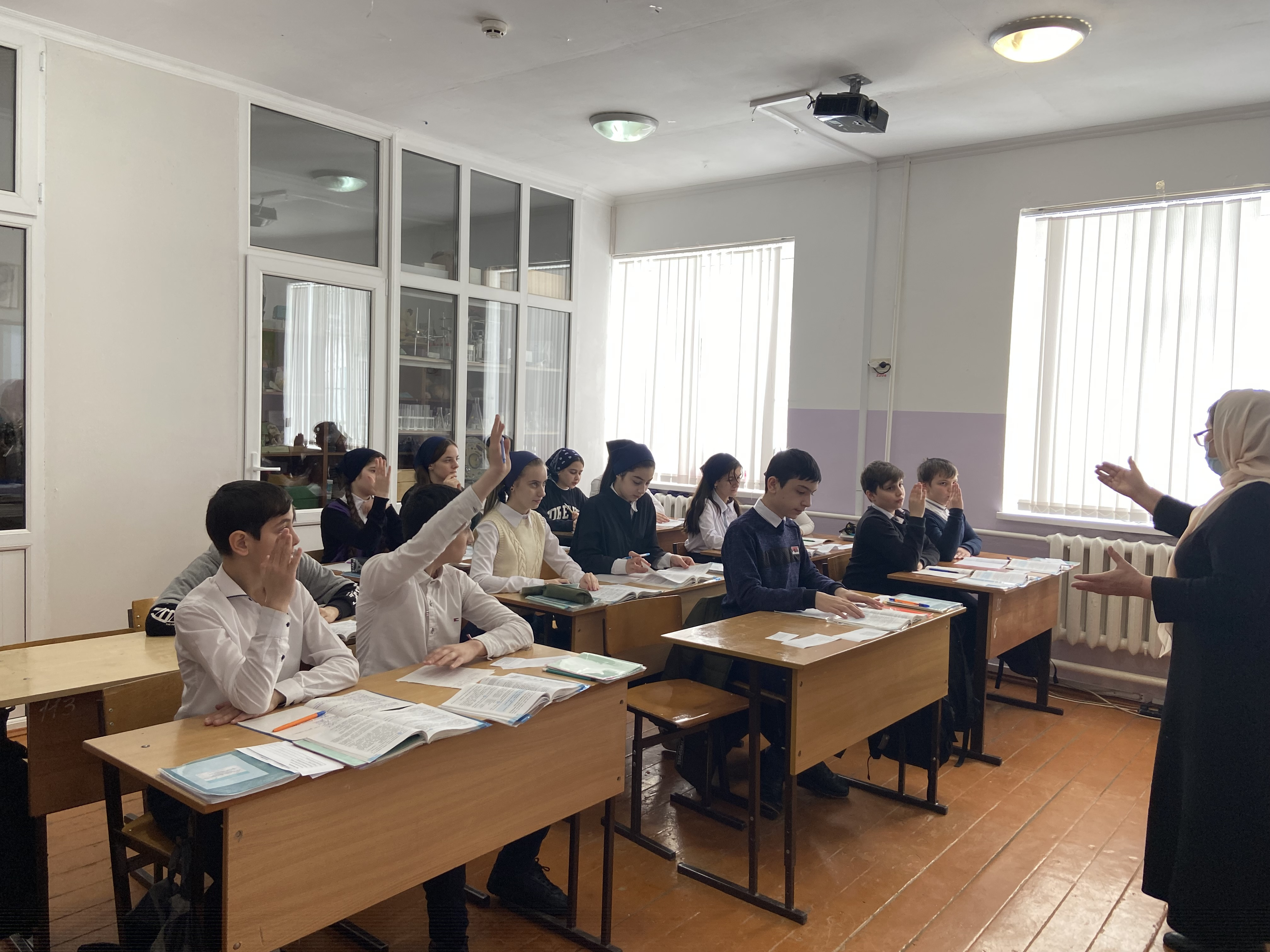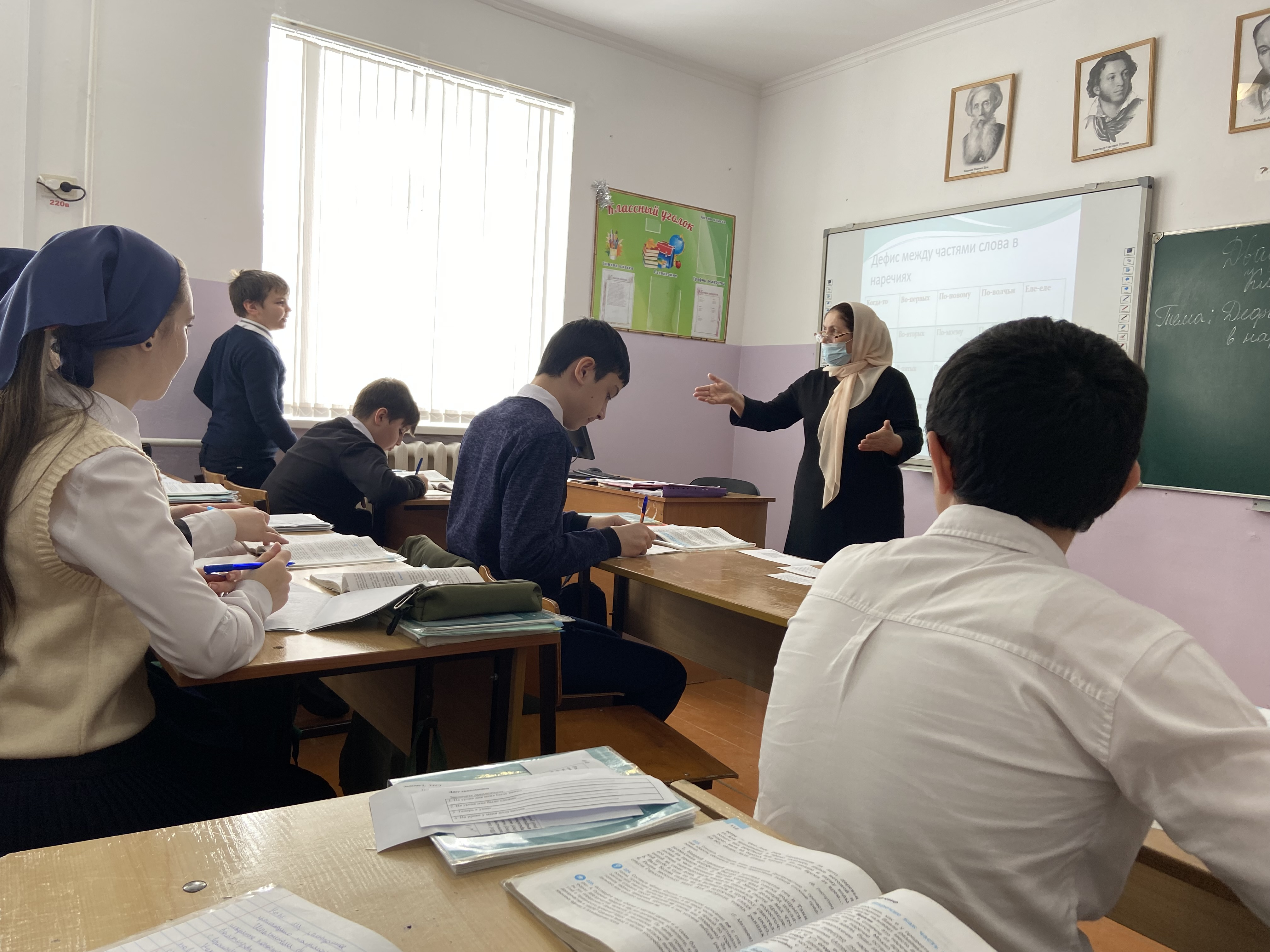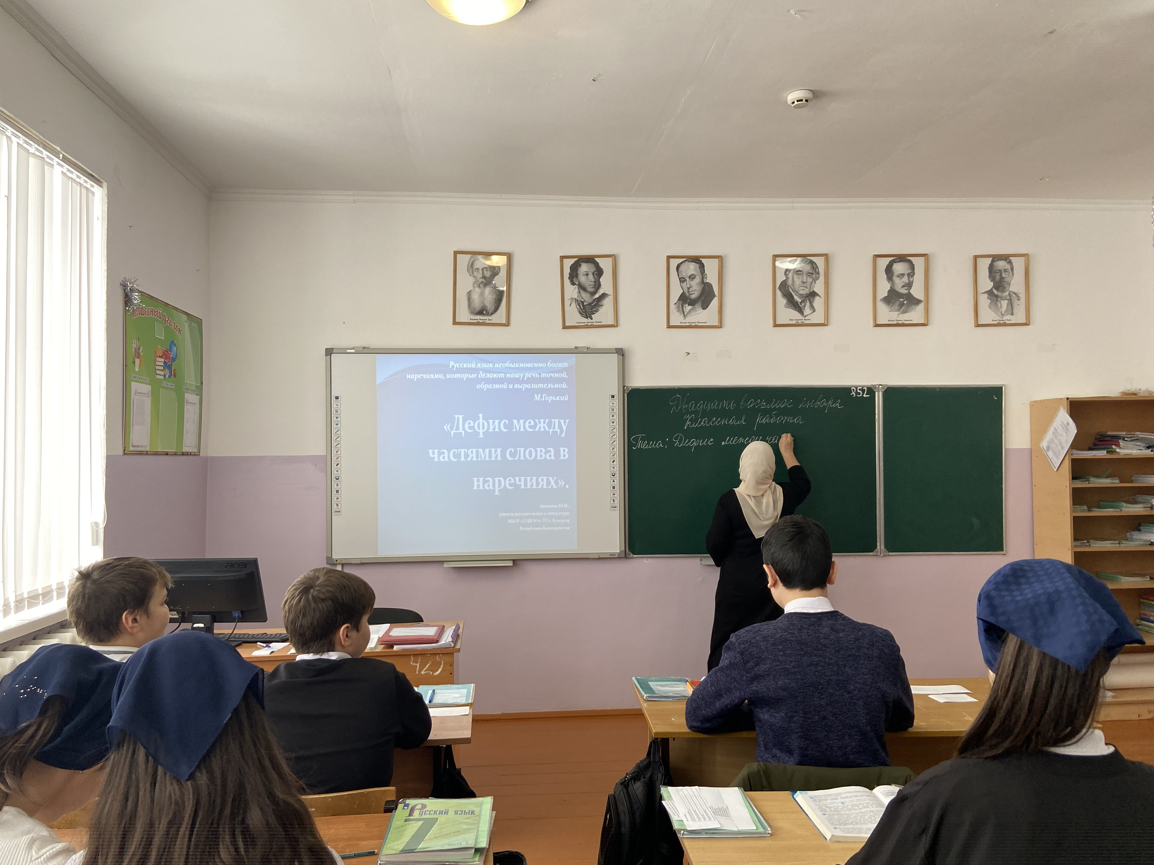 28.01.2022В рамках реализации проекта «Успех каждого ребенка» нацпроекта «Образование» в МБОУ «Ники-Хитинская СШ» учитель русского языка Вахаева Гульжан провела открытый урок русского языка в 7 классе на тему «Дефис между частями слов в наречиях».