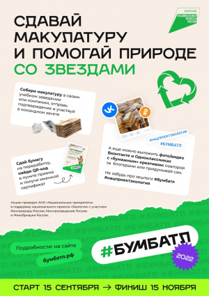22.09.2022БУМБАТЛ — это возможность проявить заботу о природе, сдав бумагу на переработку. Но, как и любой батл, это еще и соревнование по количеству собранной макулатуры! Бумагу можно сдать в детских садах, школах, вузах, колледжах, офисах компаний-участников и пунктах приема. Включайся в #БУМБАТЛ в своем регионе!А хочешь стрим со звездой — снимай и выкладывай в соцсети «бумажный» креатив. У тебя будет шанс увидеться с амбассадорами БумБатла.