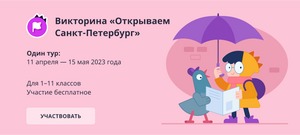 24.04.2023К 320-летию Санкт-Петербурга при поддержке национальных проектов России проходит викторина для школьников всех возрастов. Онлайн-состязание «Открываем Санкт-Петербург» познакомит школьников с занимательными и порой не очевидными фактами о городе, расскажет о возможностях, которые появились благодаря национальным проектам России. Викторина продлится до 15 мая. Ученики получат диплом, грамоту или сертификат участника в зависимости от количества набранных баллов.