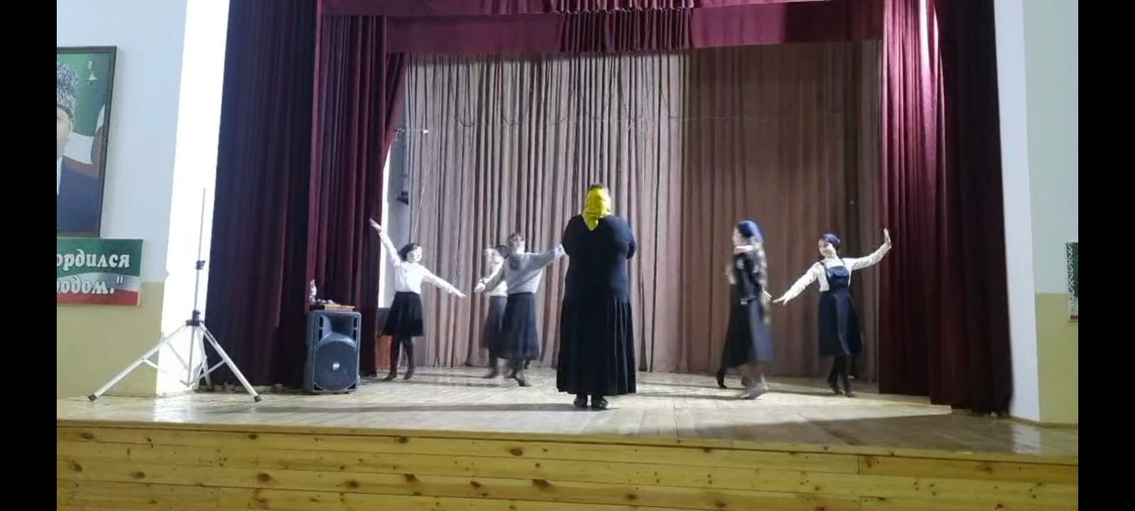 Танцевальная группа готовится к выступлению на общешкольном мероприятии ко Дню чеченского языка.