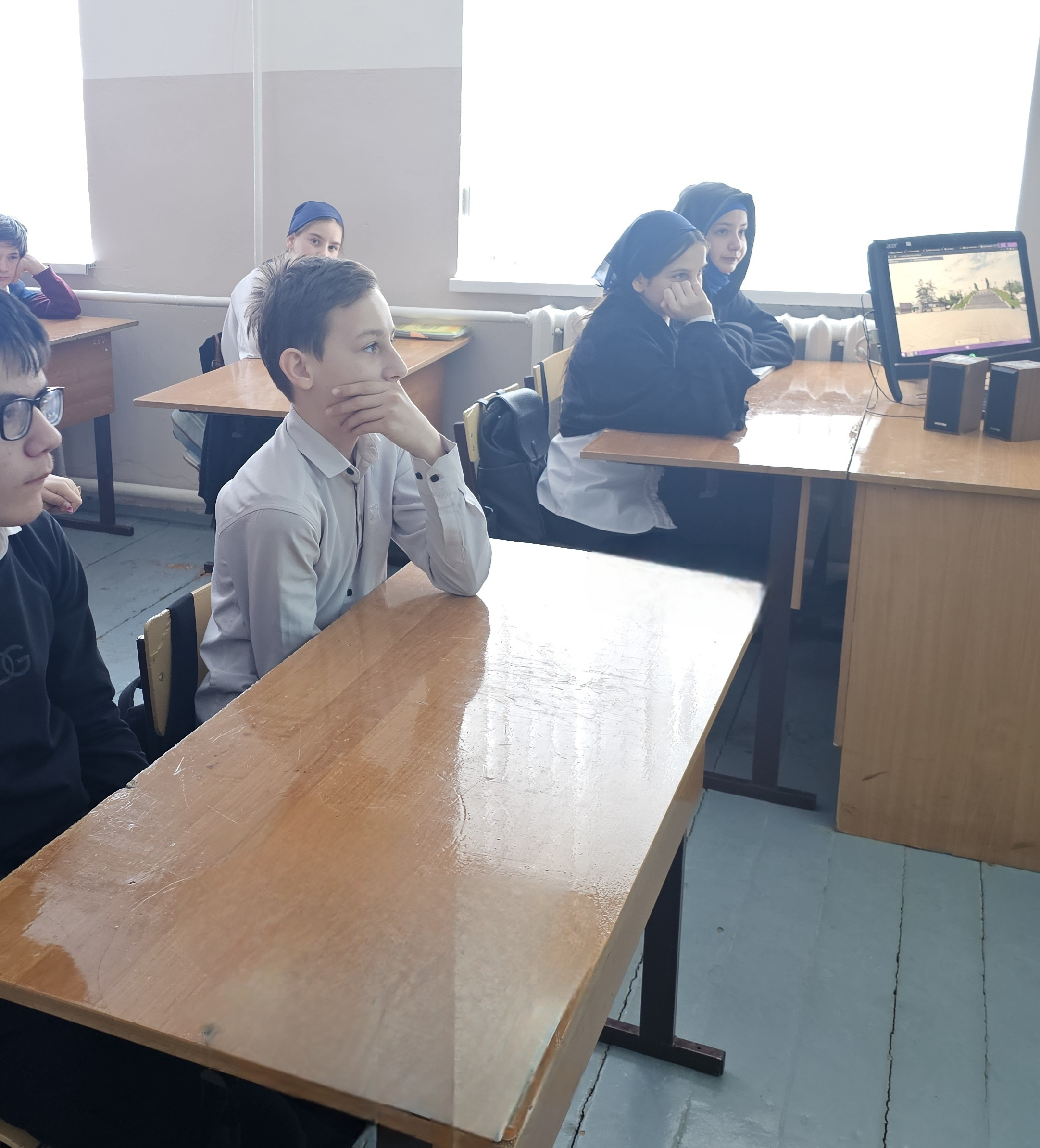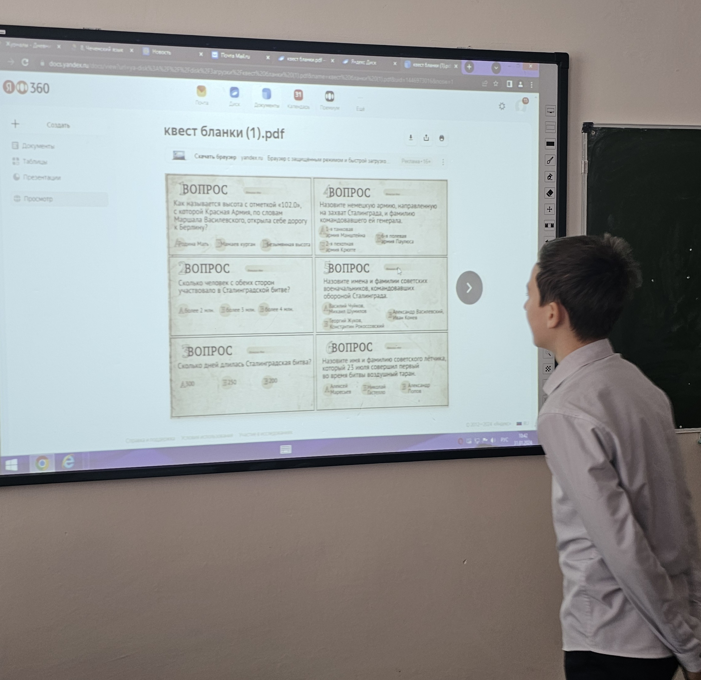 31.01.2024В МБОУ "Ники-Хитинская СШ" советник директора по воспитанию Осмаева М.К. провела в 7 классе мультимедийный квест «Великие битвы Победы». В ходе показа видеоролика были представлены реальные факты и ход сражений на основе документальной хроники. Участникам квеста предлагалось в ходе просмотра ответить на вопросы о событиях и герояхсражений. Дети узнали о героизме и мужестве наших солдат, о командном составе, познакомились с историческими памятниками той великой битвы: Мамаевым курганом, домом Павлова, посмотрели хронику Сталинградской битвы.