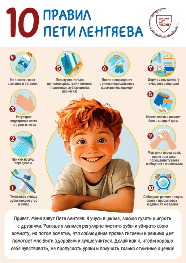 14.10.2024Привет. Меня зовут Петя Лентяев. Я учусь в школе, люблю гулять и играть с друзьями. Раньше я ленился регулярно чистить зубы и убирать свою комнату, но потом заметил, что соблюдение правил гигиены и режима дня помогает мне быть здоровым и лучше учиться. Делай как я, чтобы хорошо себя чувствовать, не пропускать уроки и получать только отличные оценки!