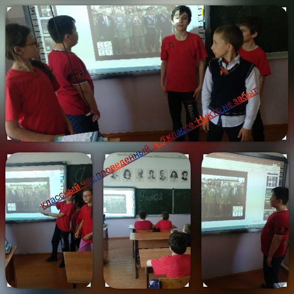 Просмотрены документальные фильмы о Великой Отечественной войне «22 июня»; «Сталинград»; «Курская дуга»; «Битва за Берлин». Особые впечатления у учащихся вызвал фильм «Блокада Ленинграда».